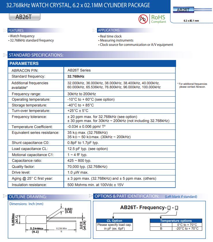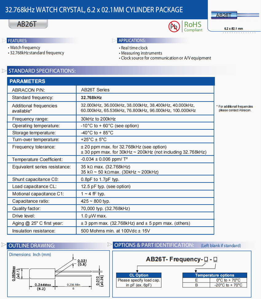 AB26T-32.768KHZ | Abracon | AB26T | 32.768 kHz | ±20ppm | 12.5 pF | |