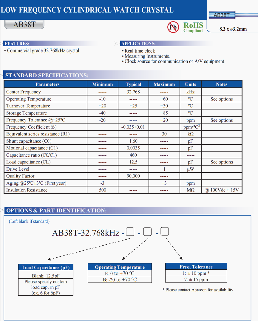 AB38T-32.768KHZ | Abracon | AB38T | 32.768 kHz | ±20ppm | 12.5 pF | |