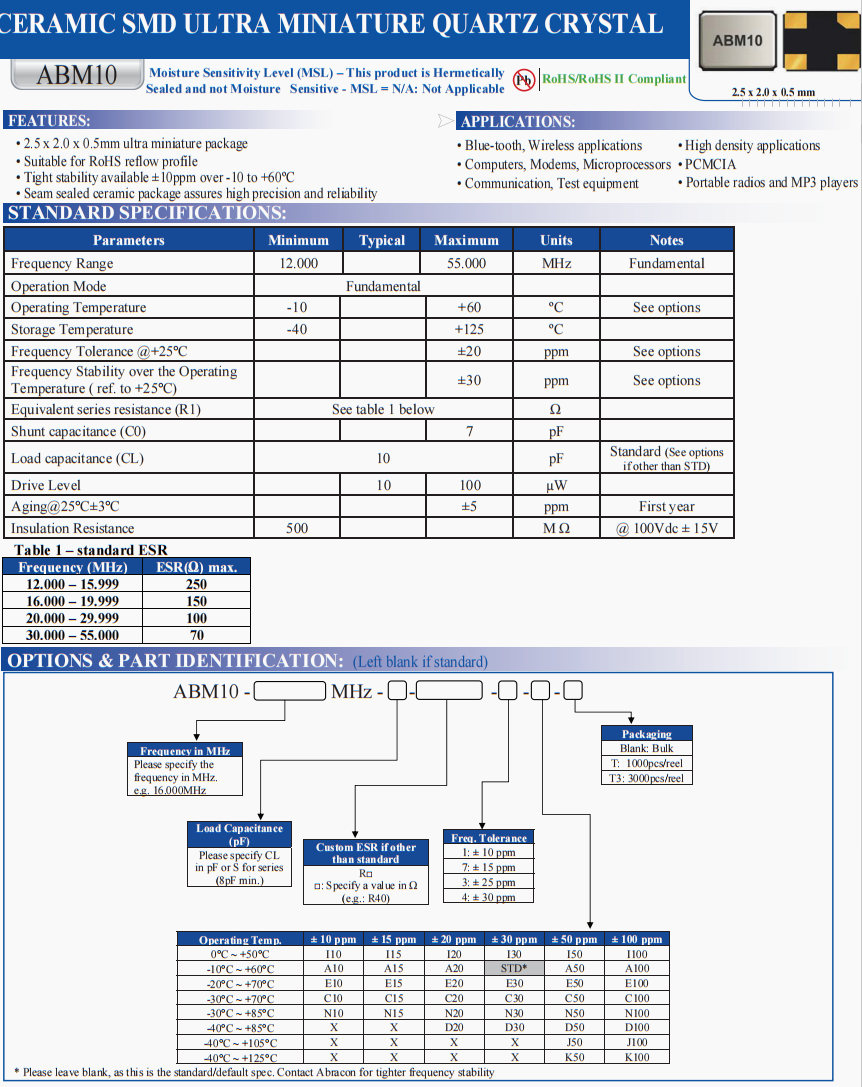 ABM10-16.000MHZ-E20-T | Abracon | ABM10 | 16 MHz | ±20ppm | ±20ppm | 10 pF |