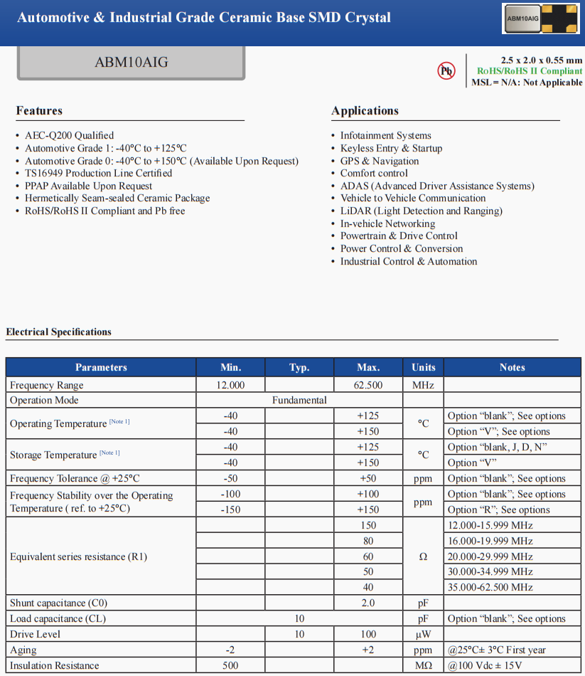 艾伯康歐美晶振,ABM10AIG-24.576MHZ-4-T3汽車多媒體晶振,ABM10AIG無鉛晶振,美國Abracon晶振公司,艾博康晶振,ABM10AIG晶振,ABM10AIG-24.576MHZ-4-T3晶振,進口晶振,無源晶振,美國晶振,高品質晶振,低損耗晶振,高精度晶振,2520晶振,四腳晶振,石英晶體,貼片晶振。適用于RoHS回流配置文件,AEC-Q200合格,汽車等級1:-40°C至+125°C,汽車等級0:-40°C至+150°C(可根據要求提供),TS16949生產線認證,PPAP可根據要求提供,密封密封陶瓷封裝,符合RoHS/RoHS II標準且不含鉛,信息娛樂系統,無鑰匙進入和啟動,GPS和導航,舒適控制,ADAS(高級駕駛輔助系統),車對車通信,激光雷達(光探測和測距),車載網絡,動力總成和驅動控制,電源控制和轉換,工業控制和自動化