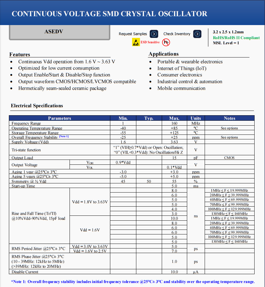 ASEDV-25.000MHZ-LR-T | Abracon晶振 | ASEDV | XO | 25 MHz | 1.6V ~ 3.6V | ±25ppm |