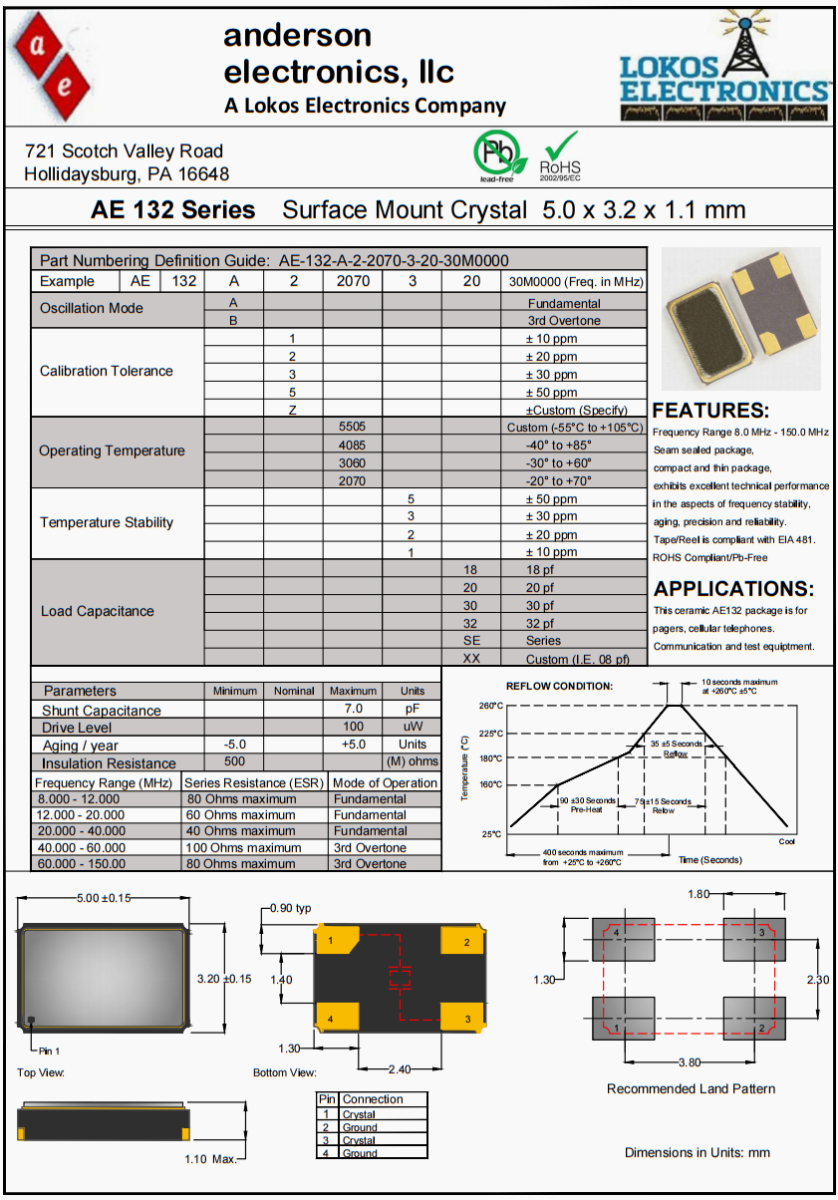 6G移動通訊晶振,Anderson高品質晶體,AE-132-A-2-2070-3-20-30M0000晶振,美國Anderson晶振公司,安德森晶振,進口晶振,AE-132晶振,無源晶振,貼片晶振,超小型晶振,2016晶振,6G通訊設備晶振,6G路由器晶振,6G網絡終端晶振,無源晶振,貼片晶振,無人機晶振,汽車輔助駕駛晶振,低損耗晶振,高品質晶振。產品具有高精度超小型的表面貼片型石英晶體振蕩器,最適用于移動通信終端的基準時鐘等移動通信領域.比如智能手機,無線通信,衛星導航,平臺基站等較高端的數碼產品,晶振本身小型,薄型具備各類移動通信的基準時鐘源用頻率,貼片晶振具有優良的電氣特性,耐環境性能適用于移動通信領域,滿足無鉛焊接的高溫回流溫度曲線要求,符合RoHS/無鉛。