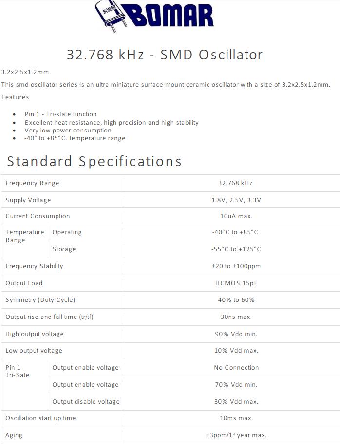 Bomar晶振公司不斷的推出滿足市場的Bomar石英晶振,石英晶體振蕩器,OCXO晶振等元件,為研發出更小封裝的進口Bomar石英晶振及具備低相位晶振,他們付出了極大的努力,并且研發出的產品通過ISO認證,質量有保障,價格合理.Bomar晶振,B1350-AEBS3T-32.768kHz晶振,高品質晶振.