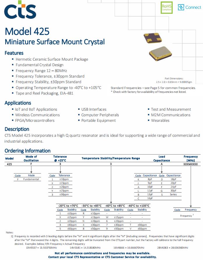 425F22A024M0000 | CTS晶振 | 425 | MHz Crystal | 24MHz |