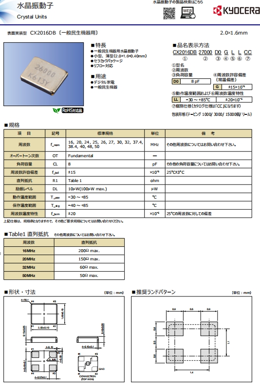 CX2016DB32000D0GPSC1 | Kyocera水晶振動子 | CX2016DB, Kyocera | MHz Crystal | 32MHz | -40°C ~ 85°C |