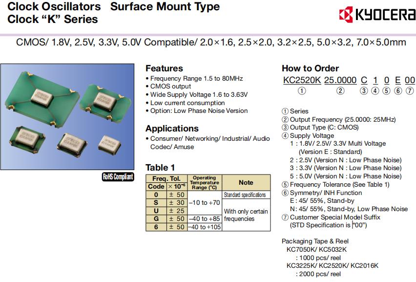 KC2520K80.0000C1GE00 | Kyocera有源振蕩器 | KC2520K, Kyocera | 80MHz | 1.6 V ~ 3.63 V | -40°C ~ 85°C |