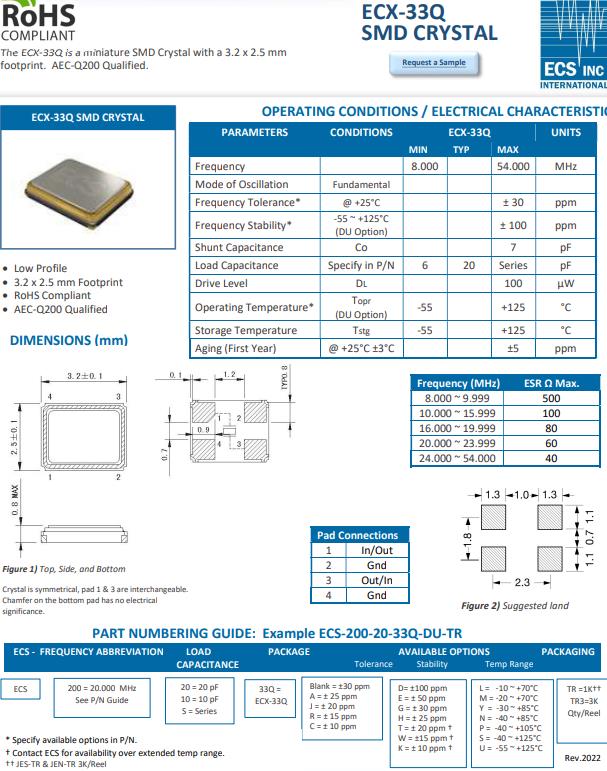 ECS-200-12-33Q-JES-TR | ECS晶振 | ECX-33Q | 20MHz | -40°C ~ 125°C |