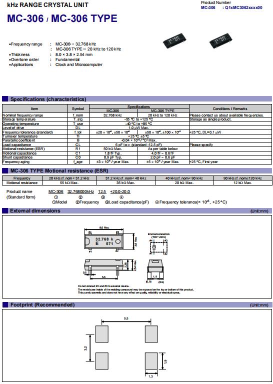 Q13MC3061001800 | 8 x 3.8 x 2.54 mm | MC-306 | 32.768K晶振 | 12.5 pF | +/-10.0 ppm | -40 to +85 °C |