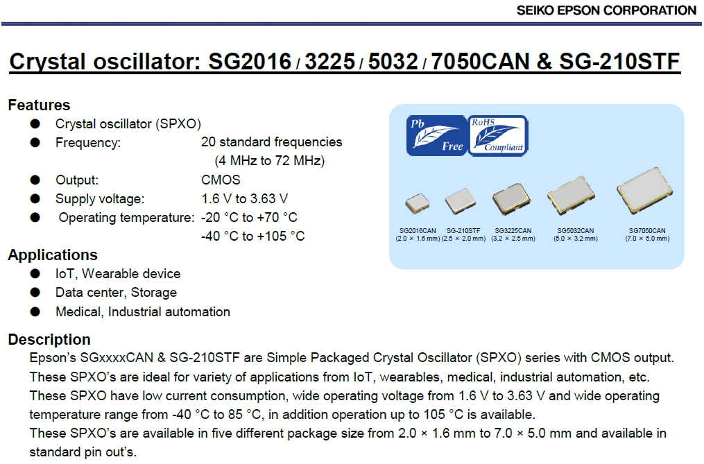 X1G0055910016 | 愛普生晶振 | SG-8018CE | 50.000000 MHz | 3.20 x 2.50 x 1.20 mm | CMOS | 1.620 to 3.630 V | -40 to 105 °C |