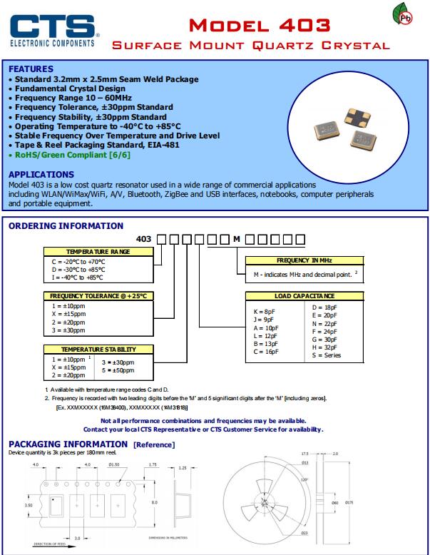 403I35E18M43200 | CTS 晶振 | 403 | 18.432MHz | ±50ppm | ±30ppm | 20pF |
