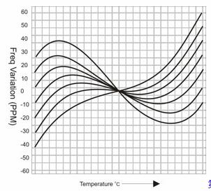 圖2顯示了各種AT切角的一些典型頻率/溫度曲線。頻率隨溫度的變化是非??深A測的,因此可以在溫補晶振(TCXO)中使用晶體元件