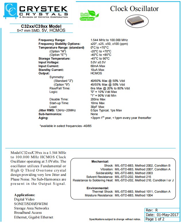 CE3292-32.000 | Crystek晶振 | C3292 | XO (Standard) | 32MHz |