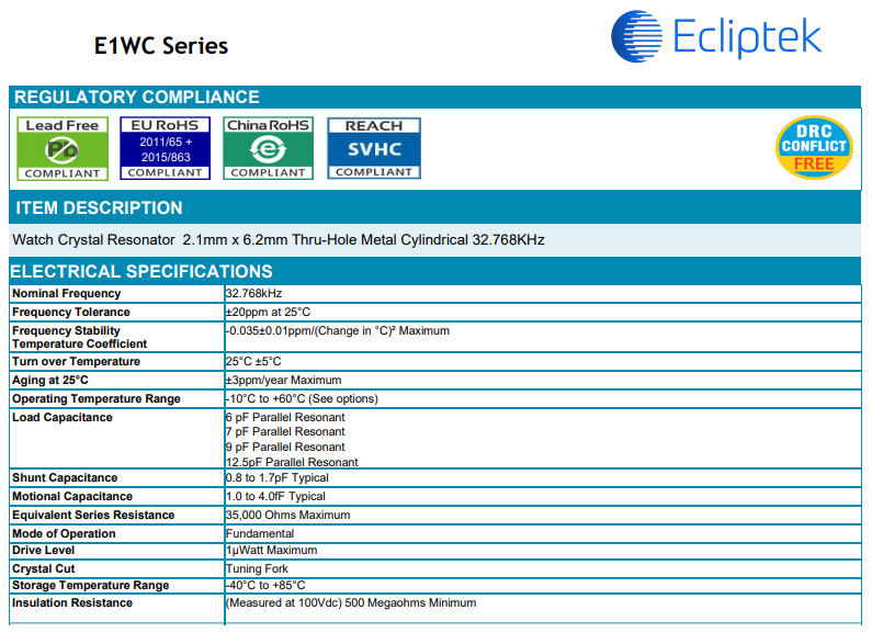 E1WCDA12-32.768K | Ecliptek晶振 | CRYSTAL 32.7680KHZ 12.5PF TH | 35 kOhms | -10°C ~ 60°C |