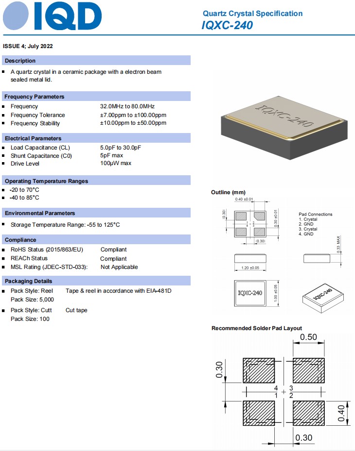 IQD晶振公司提供頻率產品是世界上最小的石英晶體IQXC-240,小體積尺寸僅為1.2x1.0mm毫米,石英晶體諧振器,高度僅為0.33毫米。IQXC-240的頻率范圍為36MHz至80MHz,非常適合物聯(lián)網(wǎng)、VGA、USB和Wi-Fi等空間寶貴的應用。在-20至70°C的商用溫度范圍內,SMD晶振 頻率穩(wěn)定性可低至10ppm,在-40至85°C的工業(yè)溫度范圍內,頻率穩(wěn)定性可低至15ppm,頻率容差可低至7ppm。符合最新一代微處理器的要求,負載電容可低至5pF。封裝在帶有電子束密封金屬蓋的4焊盤陶瓷密封封裝中,有助于將EMI輻射降至最低。根據(jù)IEC 60068-2-27標準,該產品能夠承受高達1000G的沖擊。根據(jù)EIA-481D,IQXC-240可提供磁帶和卷軸。石英晶體IQXC-240有助于將EMI輻射降至最低