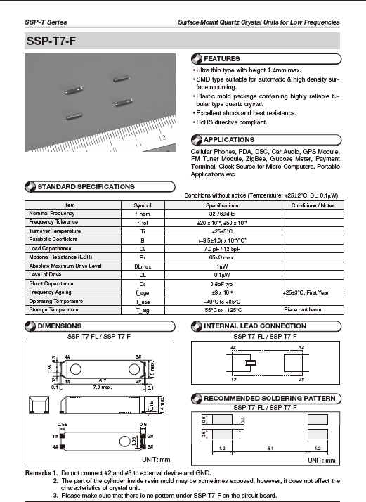 SSP-T7-F貼片晶振,也稱精工表晶,是日本精工晶振公司現在推出的銷量最多的一款32.768KHZ晶振,SSP-T7-F有高溫度物力化學性能以外,還有彈性震動耗損小,現在在品質要求可以百萬分之一的特點,因此它是一種頻率穩定的電子元件,應用廣泛于無線電,通訊,鐘表等產品上面的.