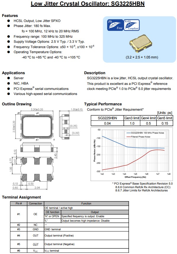 愛普生晶振SG3225HBN是一款低抖動、HCSL輸出差分石英晶體振蕩器,小體積尺寸3.2x2.5mm有源晶振,頻率范圍:100MHz至325MHz,電源電壓選項:典型值2.5V/3.3V(典型值),頻率容差選項:50×10-6,100×10-6,工作溫度選項: -40℃至+85℃和-40℃至+105℃,具有超小型,輕薄型,低電源電壓,低抖動,低功耗,低損耗,低耗能,低相位噪聲等特點,SG3225HBN貼片晶振該產品作為PCI Express參考時鐘非常出色,滿足PCIe 1.0至PCIe 5.0抖動要求,應用于計算機網絡服務器,網卡、HBA, PCI Express串行通信 各種高速串行通信。