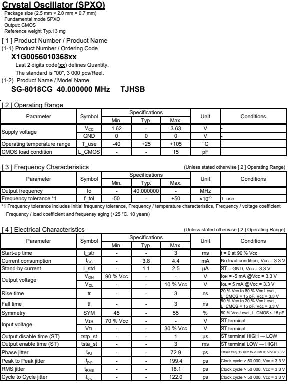 X1G005601036800 | SG-8018CG | 40.000000 MHz | 2.50 x 2.00 x 0.80 mm | CMOS | 1.620 to 3.630 V | -40 to 105 °C | +/-50 ppm | ≤ 4.4 mA |