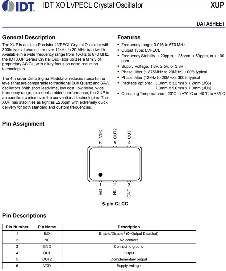 XUP736100.000JU6I | IDT晶振 | LVPECL | 3.3V | OSC XO 100.0000MHZ SMD |