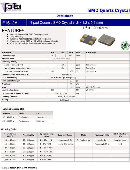 - 產品描述:FCD-Tech晶振,F1612A晶振,F1612A-2020D30F-26.000MHz晶振,貼片晶振本身體積小,超薄型石英晶體振蕩器,特別適用于有目前高速發展的高端電子數碼產品,因為晶振本身小型化需求的市場領域,小型,薄型是對應陶瓷振蕩器(偏差大...
