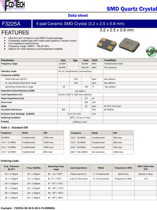 FCD-Tech Crystal專業給市場提供的廣泛的荷蘭 FCD-Tech晶振,有源晶振,石英晶體,石英晶體振蕩器,VCXO壓控晶振等元件,提供的工業級機械等產品中,具有高精度,低抖動,低相位噪聲等特點,符合當下市場對頻率元器件的需求.FCD-Tech晶振,F3225A晶振,F3225A-3050D303-24.000MHz晶振.