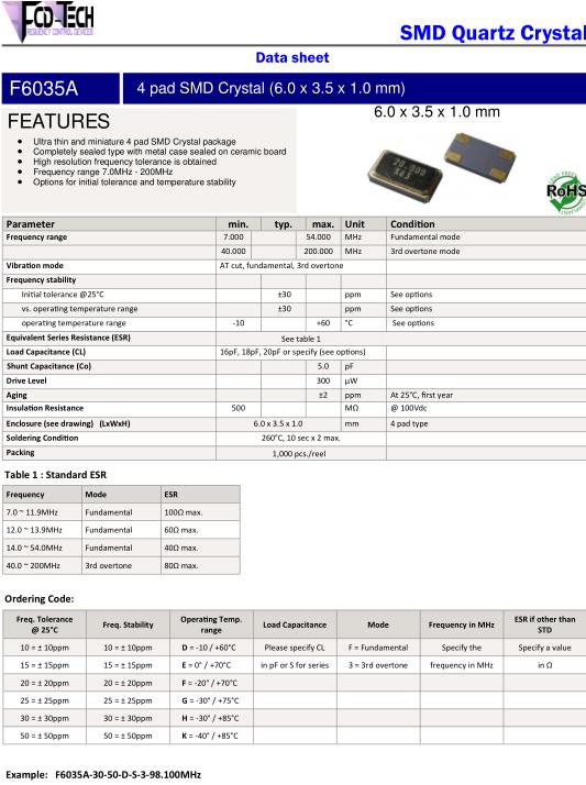 FCD-Tech晶振,F6035A晶振,F6035A-3050DS3-20.000MHz晶振