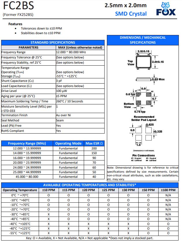 FX252BS-20.000 | FOX晶振 | FX252B | MHz Crystal | 20MHz | ±50ppm |