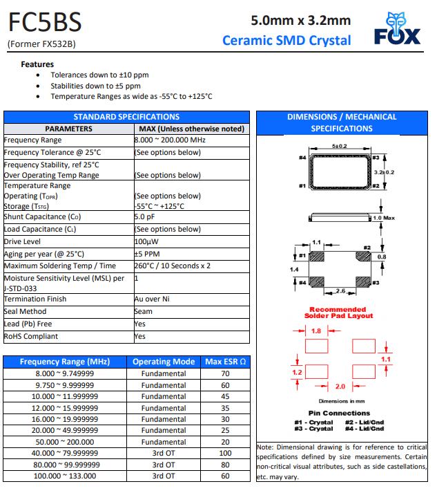 FX532B-20.000 | FOX晶振 | FX532B | MHz Crystal | 20MHz | ±50ppm |