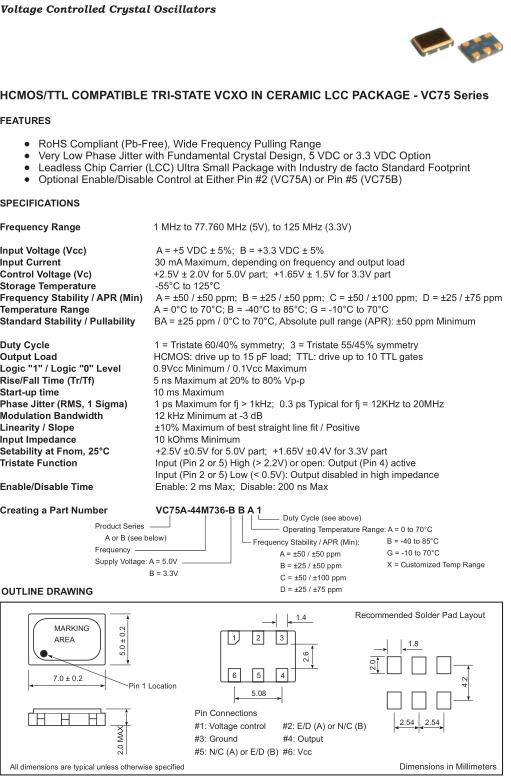 - 產品描述:Fortiming晶振,VC75晶振,VC75A-24M736-BBA1晶振,壓控晶振(VCXO),壓控石英晶體振蕩器基本解決方案,PECL輸出,輸出頻率60MHz到200MHz之間,出色的低相位噪聲和抖動,三態功能,應用:SDH/SONET,以太網,基站,筆記本晶振應用,符...