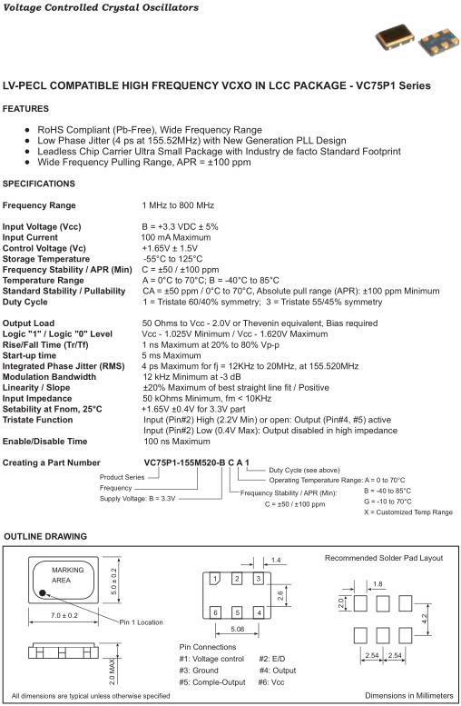 - 產品描述:Fortiming晶振,VC75P1晶振,VC75P1-26M520-BCA1晶振,壓控晶振(VCXO),壓控石英晶體振蕩器基本解決方案,PECL輸出,輸出頻率60MHz到200MHz之間,出色的低相位噪聲和抖動,三態功能,應用:SDH/SONET,以太網,基站,筆記本晶振應用...