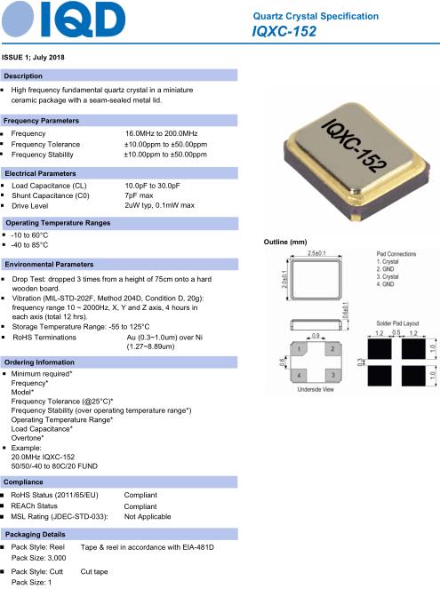 IQD伊克德晶振在1988年獲得證書到BS 5750,所有IQD石英晶振,石英晶體諧振器,壓電水晶的設計、制造和測試設備都被認證為ISO 9001:2008.我們的質量管理體系不斷完善和適應各個領域的使用,以滿足國際標準和客戶的需求.IQD晶振,IQXC-152晶振,20.0MHz-IQXC-152-50/50晶振.