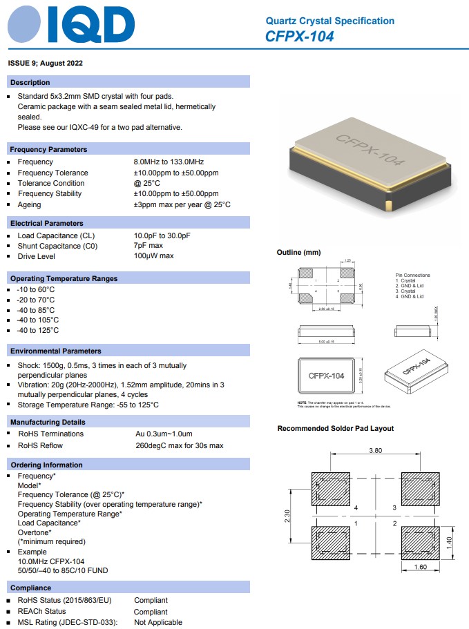 LFXTAL059158REEL | IQD晶振 | CRYSTAL 8.0000MHZ 16PF SMD | CFPX-104 |