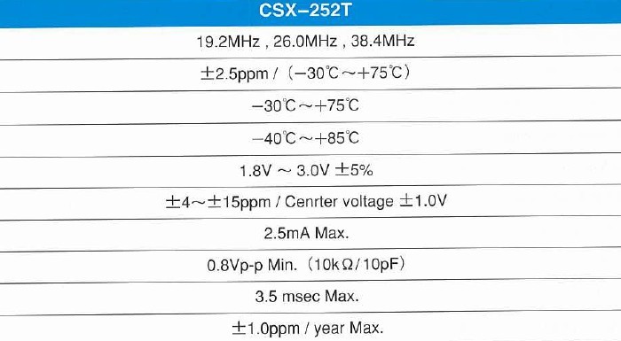 具有最適合于移動通信設備用途的高穩定的頻率溫度特性。為對應低電源電壓的產品。(可對應DC +1.8 V±0.1 V to +3.2 V±0.1 V )高度:最高1.0 mm、體積:0.007 cm3、重量:0.024g,超小型、輕型。低消耗電流、表面貼片型...