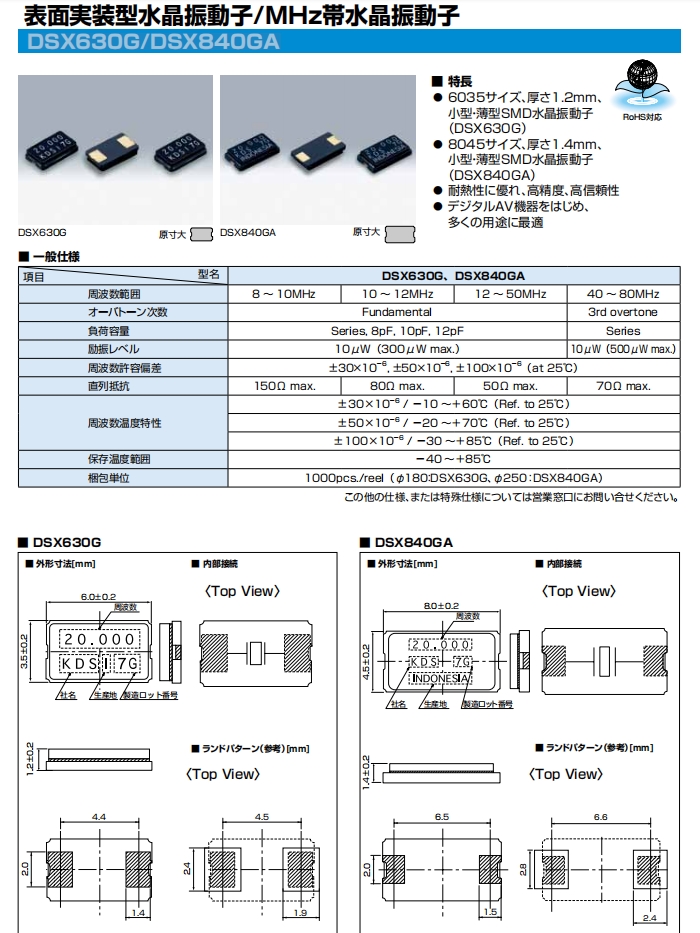 梱包単位 | 1000pcs./reel(φ180:DSX630G、φ250:DSX840GA) |
