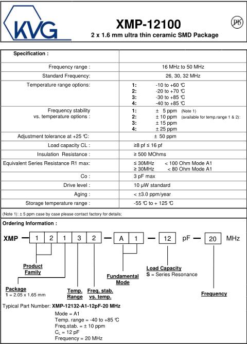 KVG晶振規格 | 單位 | XMP-12100晶振頻率范圍 | 石英晶振基本條件 | |