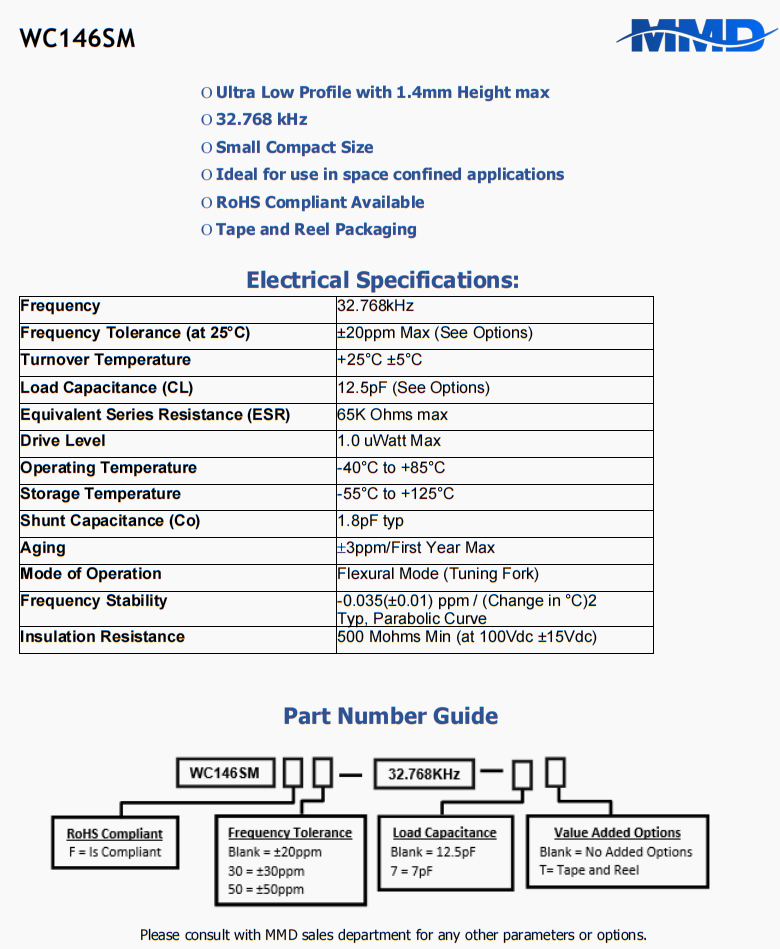 WC146SMF-32.768KHZ-T | MMD | WC146SM | 32.768 kHz | ±20ppm | 12.5 pF | |