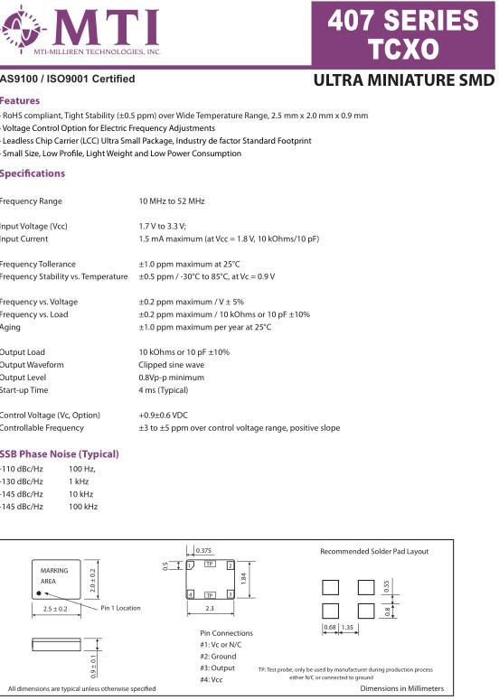 MTI Crystal可稱為米利倫晶振,擁有領先的制造技術和提供世界一流的客戶服務,專業提供MTI有源晶振,溫補晶振,恒溫晶振等頻率元件,所有產品保證是高質量,精確和穩定的頻率控制元件.MTI晶振,407晶振,TCXO溫補晶振.