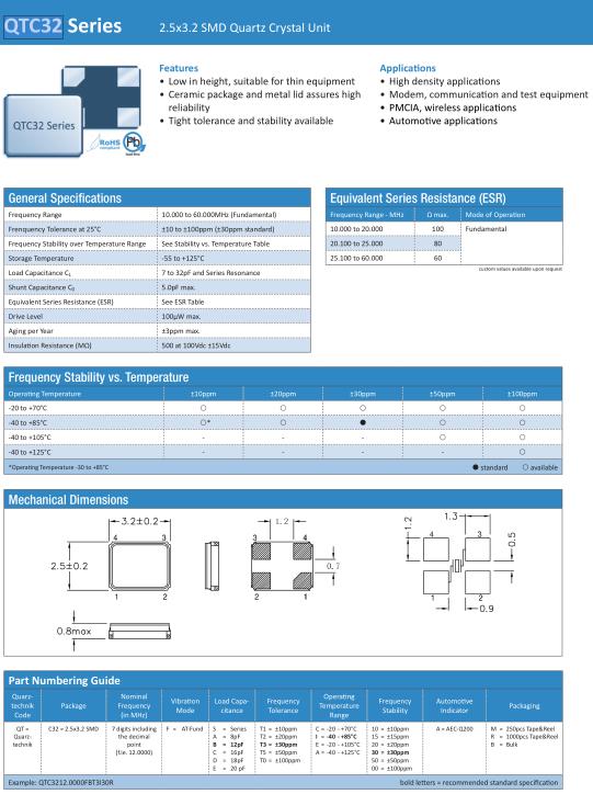 Quarztechnik晶振,QTC32晶振,QTC3212.0000FBT3I30R晶振