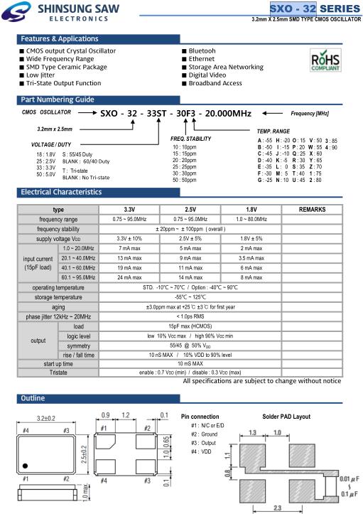 SHINSUNG晶振,SXO-32晶振,SXO-32-33ST-30F3-20.000MHz晶振