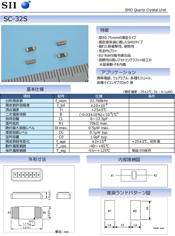 Q-SC32S03210C5AFE | Seiko精工晶振 | SC-32S | kHz Crystal (Tuning Fork) | 32.768kHz | ±10ppm |