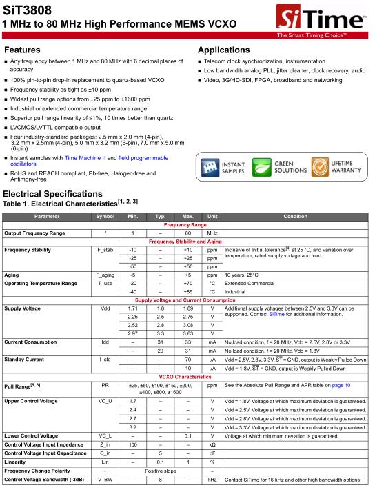 SiTime Crystal是MegaChips公司的獨(dú)立子公司,主要以生產(chǎn)高精度石英晶體振蕩器,可編程晶體振蕩器,MEMS晶振等器件為主.SiTime晶振主要以生產(chǎn)MEMS晶振,VCXO壓控晶振等頻率元件.SiTime晶振,SiT3808晶振,SiT3808AC-22-33EH-24.000000D晶振.
