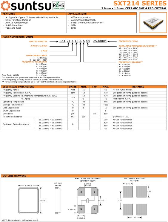 Suntsu晶振規格 | 單位 | SXT214晶振頻率范圍 | 石英晶振基本條件 |