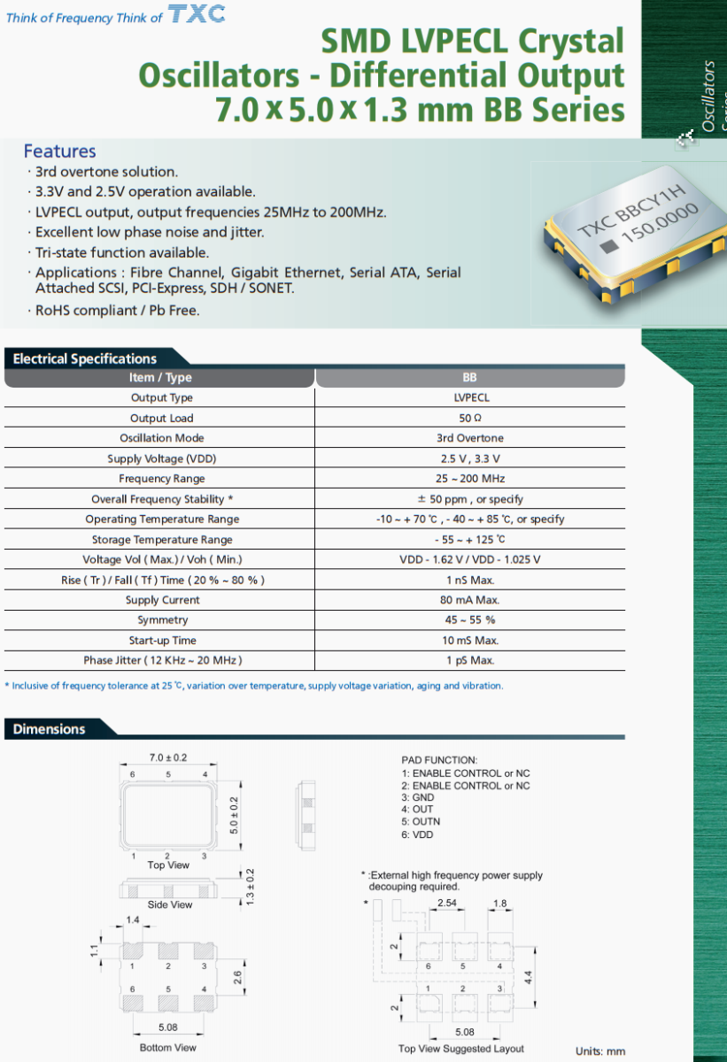BB50070002 | TXC晶振 | BB | 50 MHz | LVPECL | 3.3V | ±50ppm |