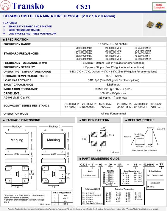 SPECIFICATION-Transko晶振 | CS21晶振 |