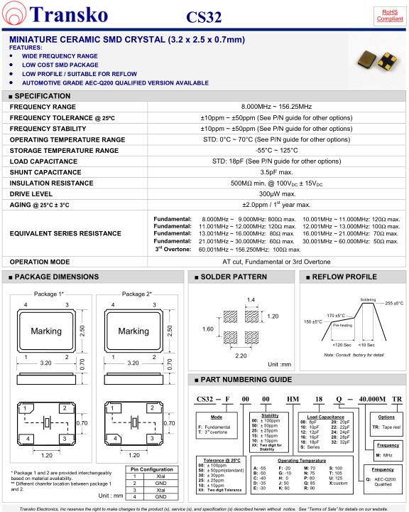 SPECIFICATION-Transko晶振 | CS32晶振 |