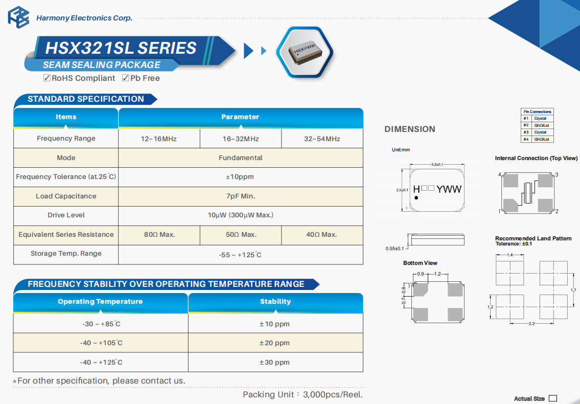 X3S016000DC1H‐V | 加高晶振 | HSX321S | 16 MHz | ±30ppm | 12pF |